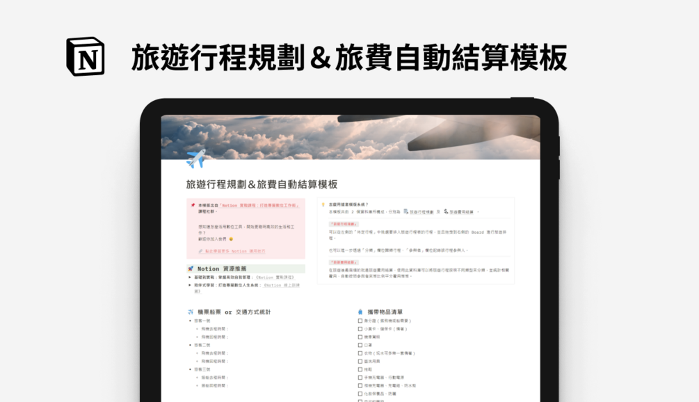 單個頁面一目了然交通、攜帶物品、行程安排以及旅費結算