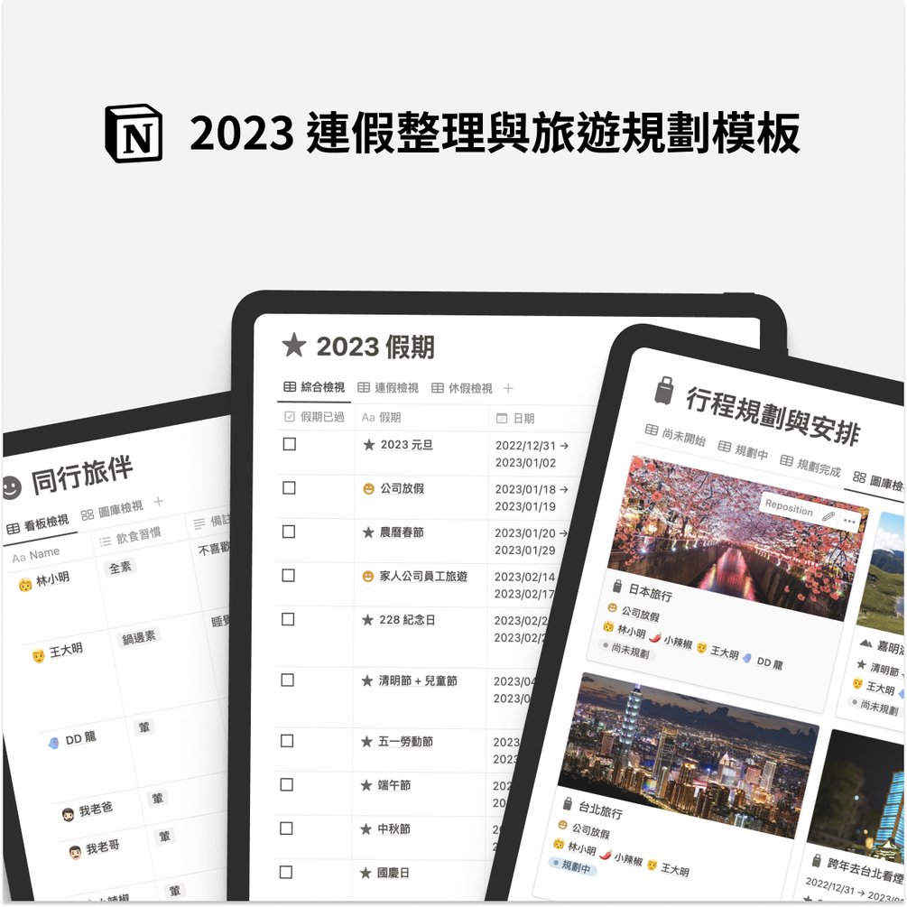 - 本模板可以幫助你一覽 2023 連假,讓你更早規劃未來旅遊行程,不用再擔心太晚規劃訂不到房,或是搶不到便宜的機票和住宿!