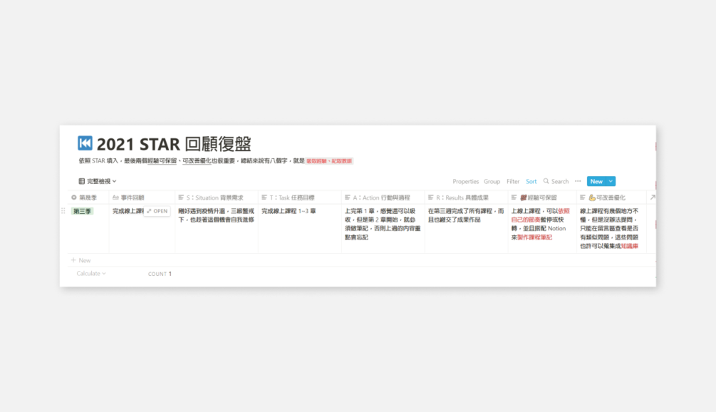 1. 利用 STAR 模型總結過去經驗。 2. 根據自己需求制定年、季、月、週目標,並且有進度條審視自己達成率。